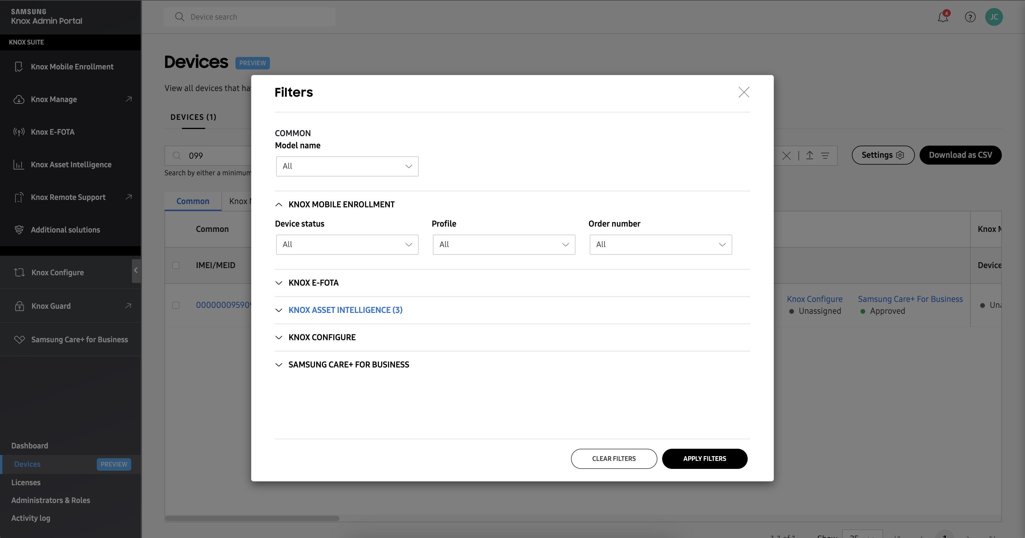 If you’d like to narrow down your search further, simply add filters. You can filter by which Knox service the device is enrolled in, or common information such as device status.