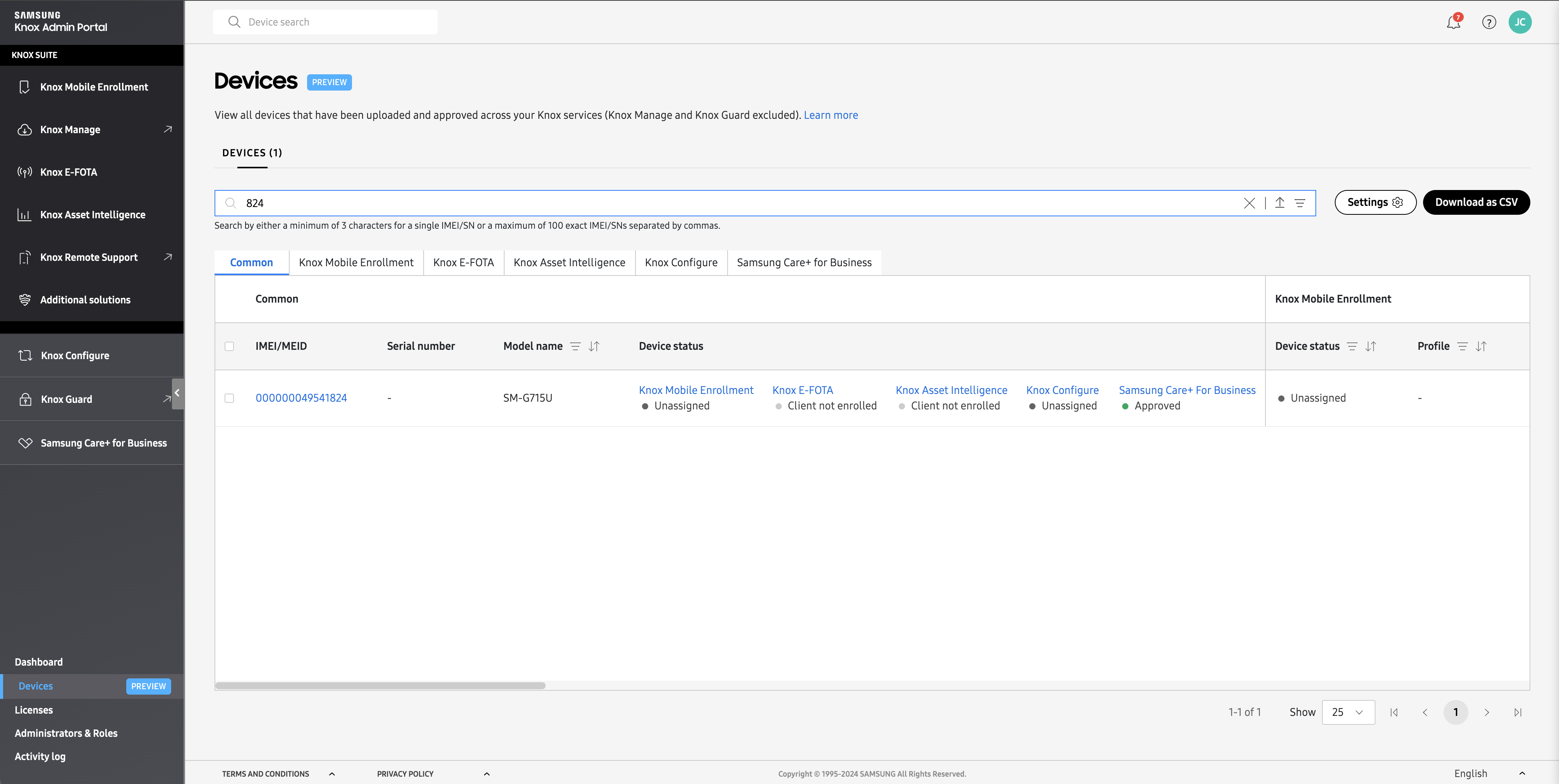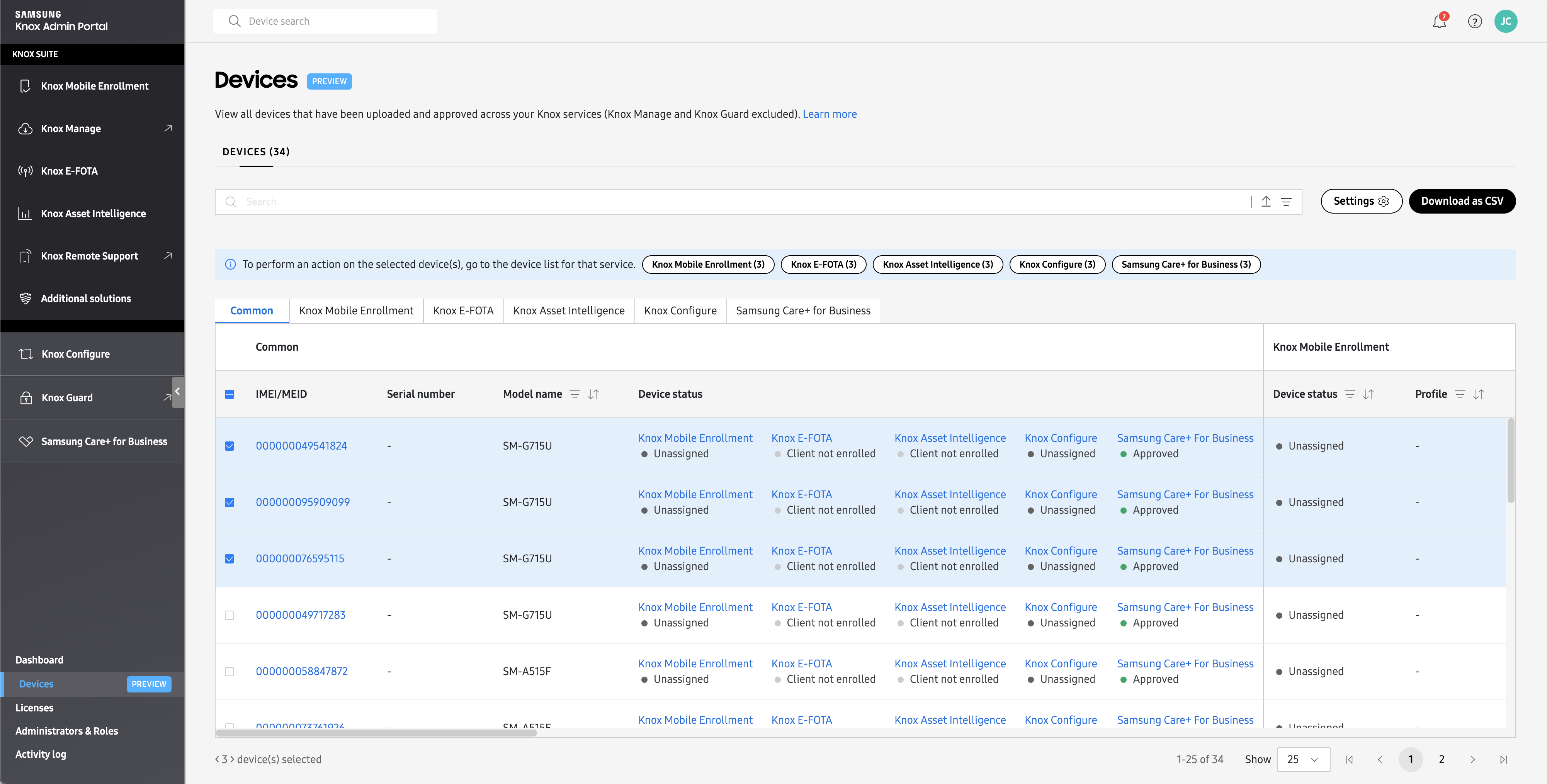 The common device list consolidates information about your uploaded and approved Samsung devices. It’s a one-stop shop for IT admins to check the status of devices across all Knox services.
