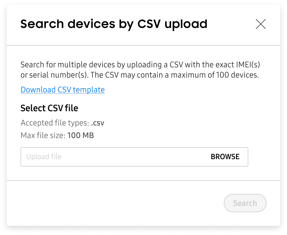 To find multiple devices: Enter a maximum of 100 exact device IMEIs and serial numbers, separated by commas. You can save even more time by uploading a CSV file containing up to 100 device IMEIs or serial numbers you want to find.