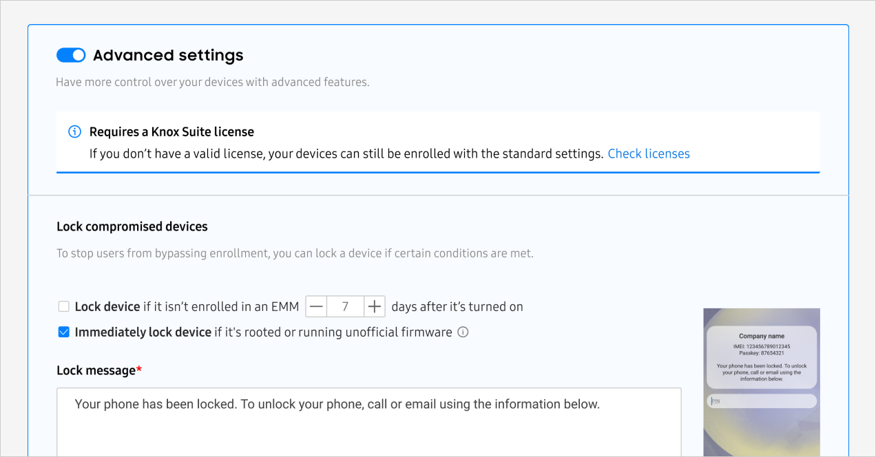 This means whether you need to lock compromised devices or enable other enrollment security features, you can activate these settings with a simple toggle switch.