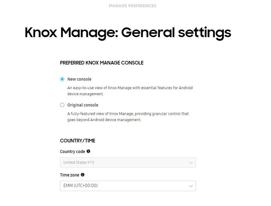 To switch between the new and original consoles, go to your Knox Admin Portal settings and select your preferred view under Knox Manage.