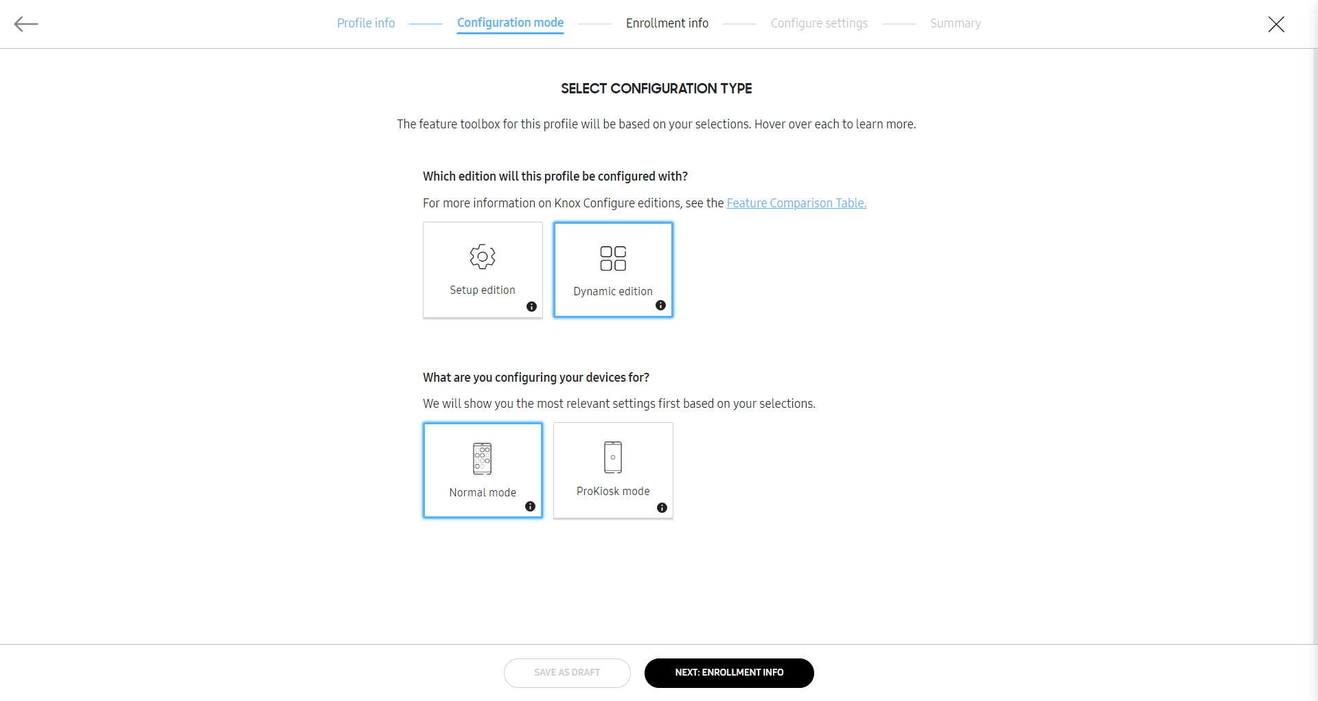 Next, on the Configuration mode page, you can choose the edition of Knox Configure and profile type you want to configure the device with. Each edition offers a unique set of features and customization options—for details, see About Knox Configure profiles.