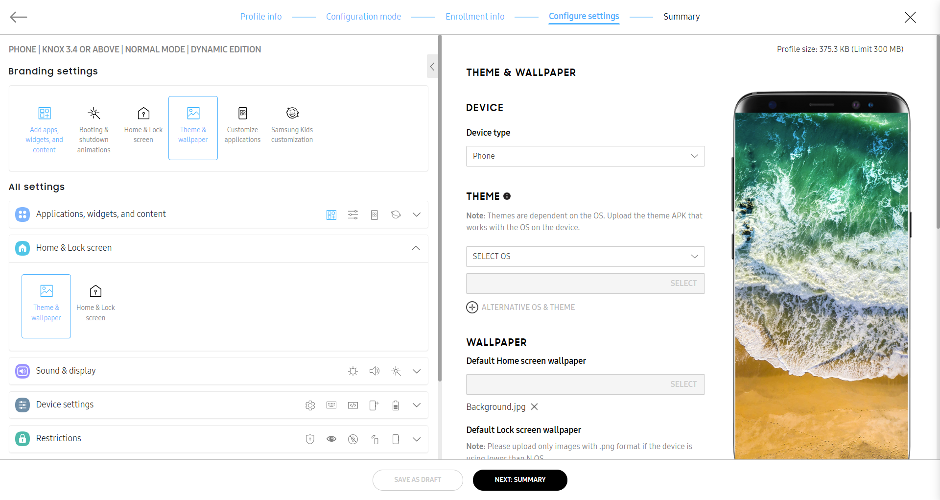 In Knox Configure, device settings, apps, custom branding and other content are saved in profiles, which can then be deployed to your devices. Starting with Knox Configure 23.06, we’ve redesigned the console to make creating a profile with customized branding even easier.