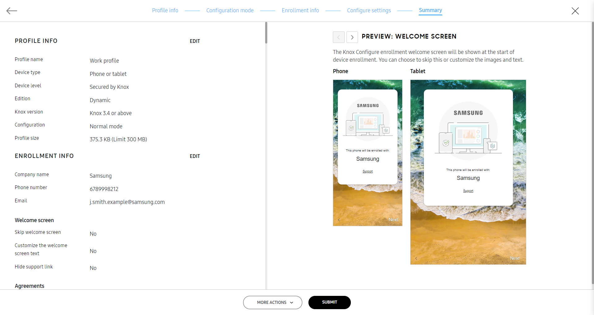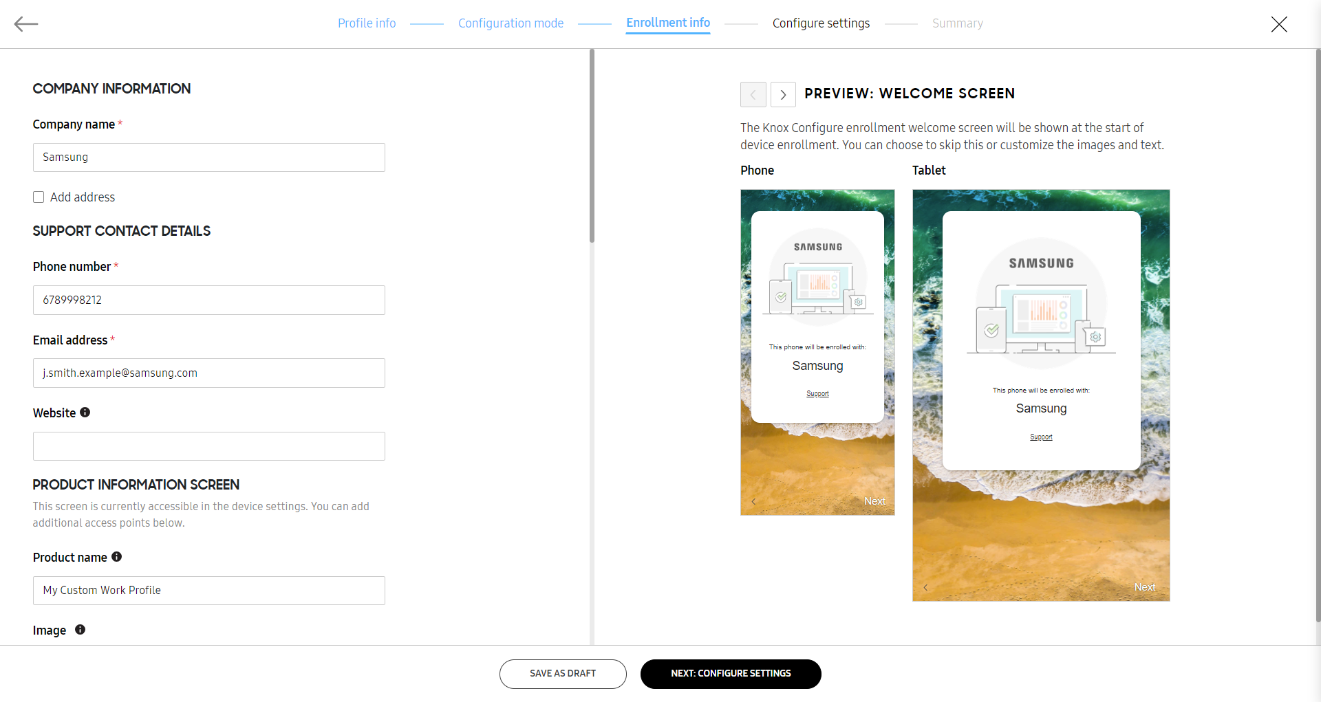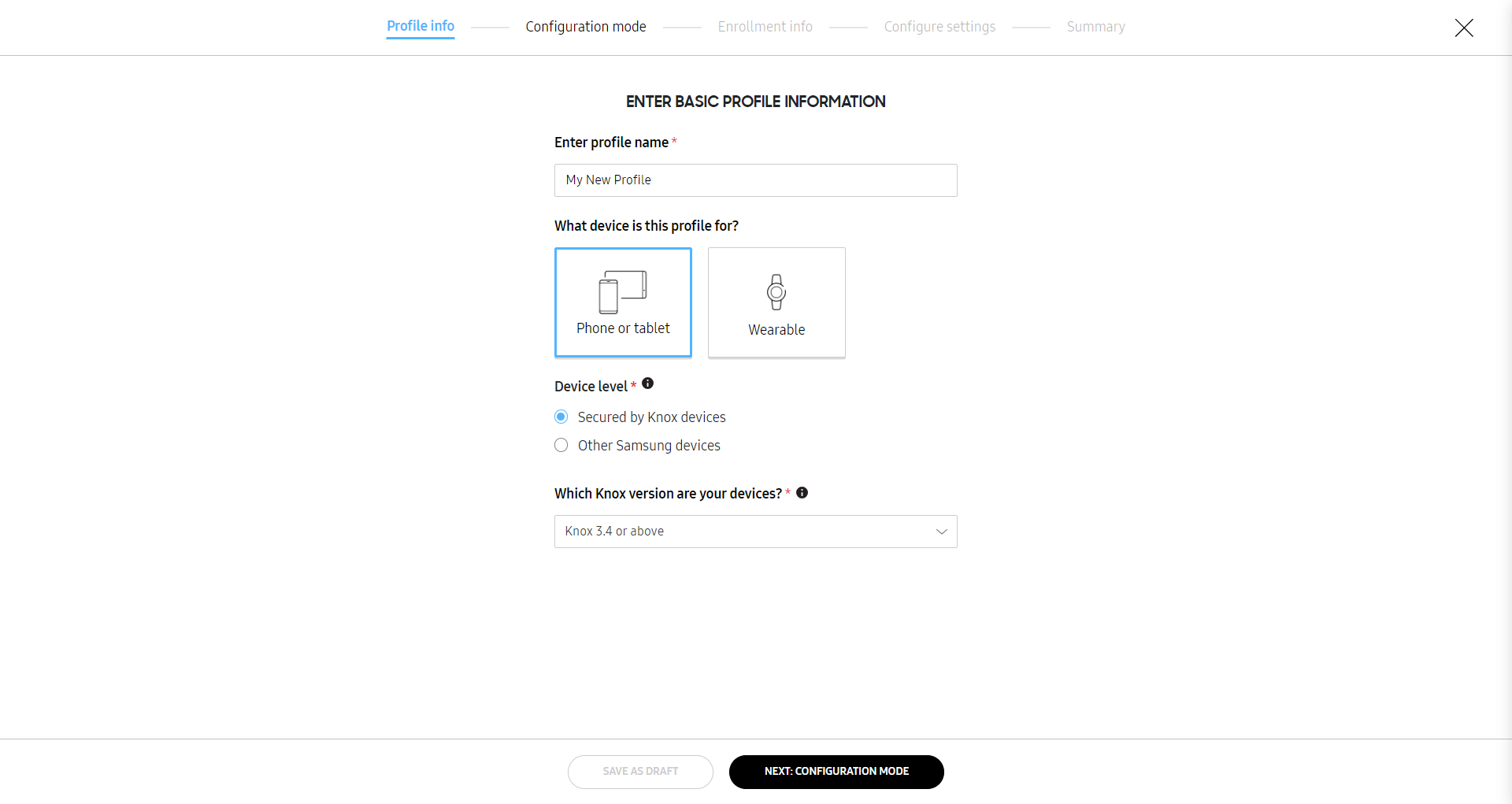 1. Profile info: Give your profile a name and specify the device type and Samsung Knox version you want to use.