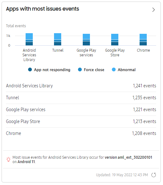 Knox Suite takes crucial diagnostic information from work devices and apps and lays it all bare in crystal-clear dashboards. These are packed with information on app events which makes spotting trends and problematic apps effortless:
