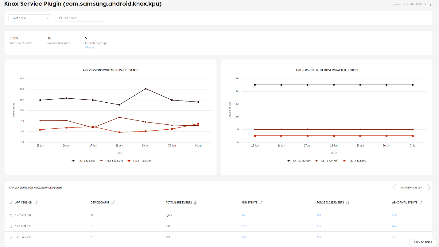 Take non-responsive apps, for example. Knox Suite takes note of instances an app doesn't respond or behaves abnormally. Knox Suite then takes all this recorded data and presents it in an easy-to-scan dashboard, with easily digestible charts and tables showing the app's names, affected versions, and call stack  of the issue events.