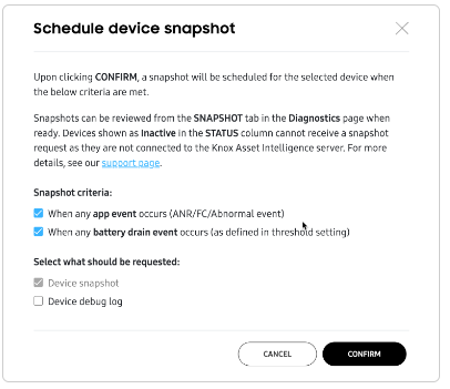IT teams that want more detailed information to pinpoint exact data points can utilize Knox Suite's scheduled device snapshot feature. This functionality allows them to automatically collect logs whenever a specific condition occurs on the device, enabling them to home in on specific issues ranging from apps constantly crashing to a device's battery draining too quickly.