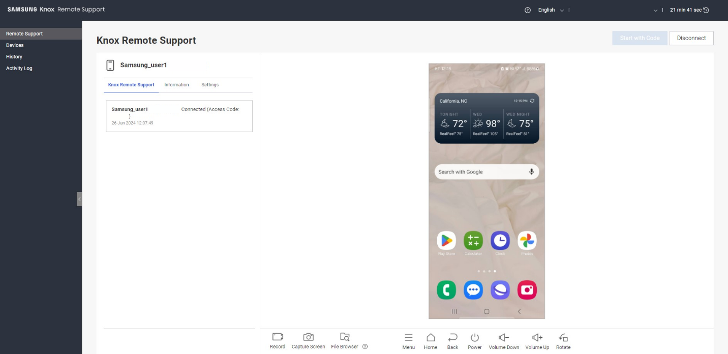 Employees don’t need to put their productivity on pause to get their device fixed. Instead of bringing it into the office or mailing it for repairs, IT admins can remotely access devices. Knox Suite’s powerful remote IT support software emulates physical keys, allowing IT admins to use important controls like Home, Power, and volume.