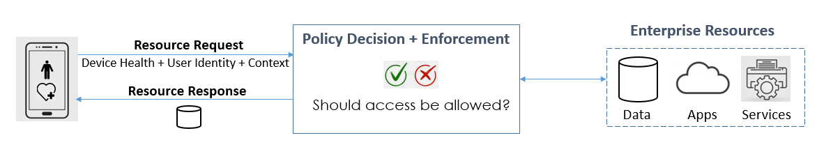 Additionally, Zero Trust allows an enterprise to regulate access to its resources based on a continuous evaluation of contextual information from multiple data sources. This contextual information, or context, takes into consideration sources including user and device identity, device health, location, and frequency of access. For each resource request, a device evaluates the context and sends it to a Policy Decision and Enforcement point (PDP). The PDP then decides whether to allow the endpoint access to the requested enterprise resource. If access is allowed, the requested resource is sent back to the device.