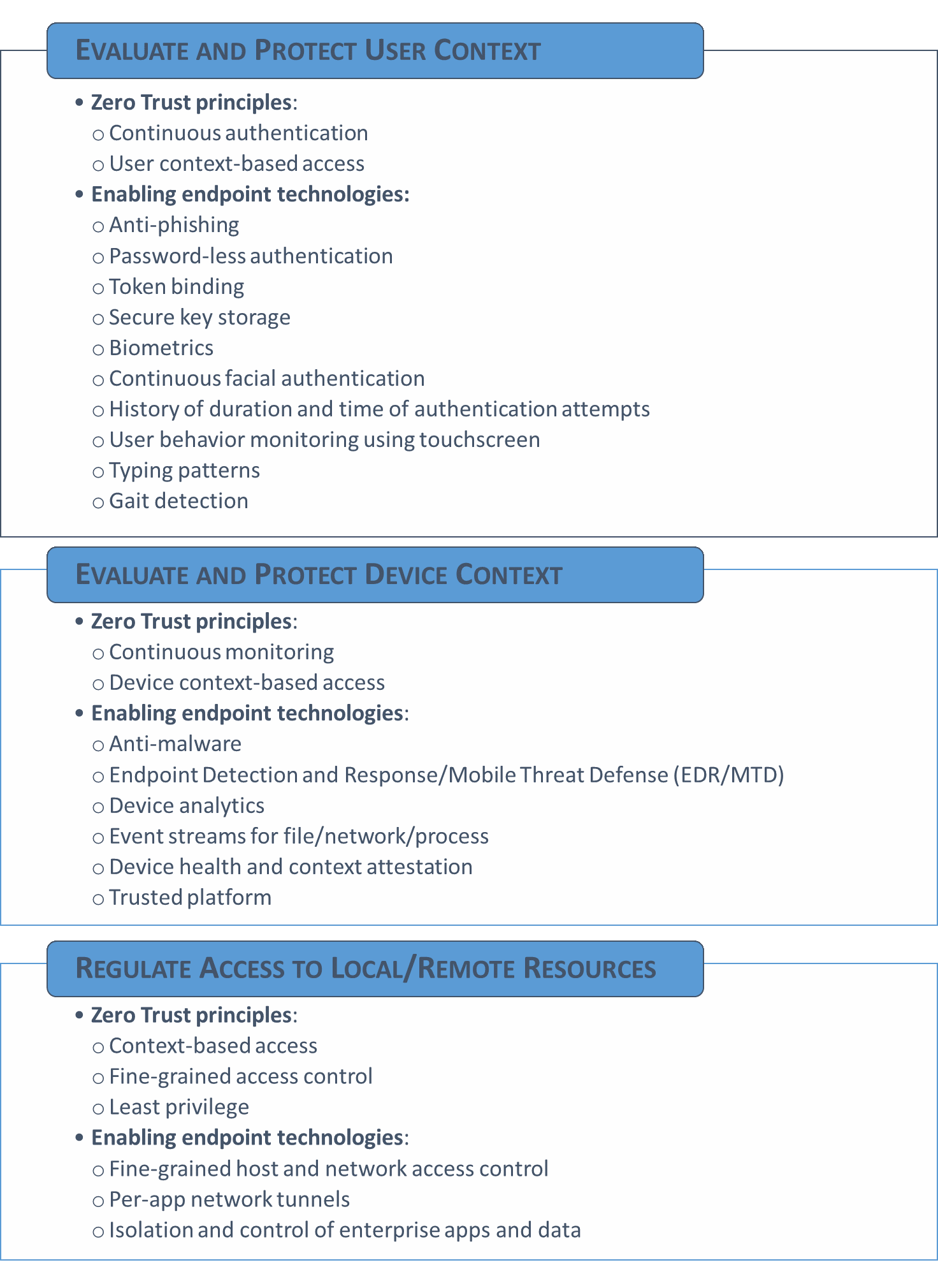 Regulating access to local and remote resources — Once resource access is granted, the endpoint has to regulate access to local on-device and remote resources following the Zero Trust principles of least privilege and fine-grained access control. The endpoint also needs to take protective measures if it detects suspicious user or device behavior.